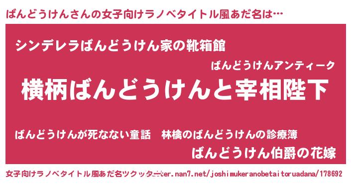 | 男性向けラノベタイトル風あだ名 | 『ばんどうけんに滅ぼされるだけの簡単なお仕事です』 |
