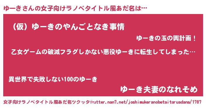 | 男性向けラノベタイトル風あだ名 | 『魔弾の王とゆーき』『ゆーきの憂鬱』 |