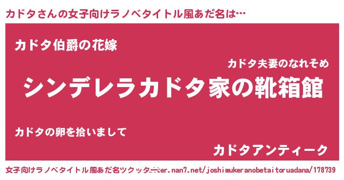 | 男性向けラノベタイトル風あだ名 | 『冴えないカドタの育てかた』 |