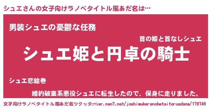 | 男性向けラノベタイトル風あだ名 | 『シュエの憂鬱』『はたらくシュエさま!』 |
