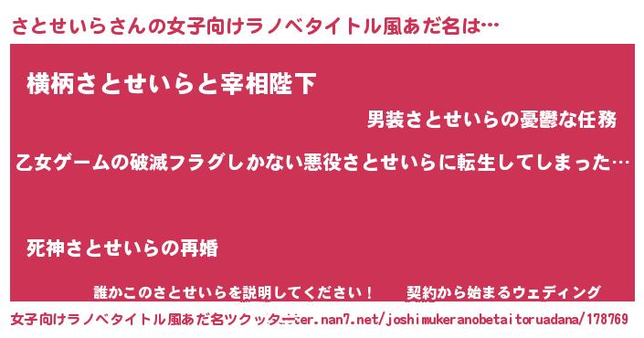 | 男性向けラノベタイトル風あだ名 | 『この素晴らしい世界にさとせいらを!』 |