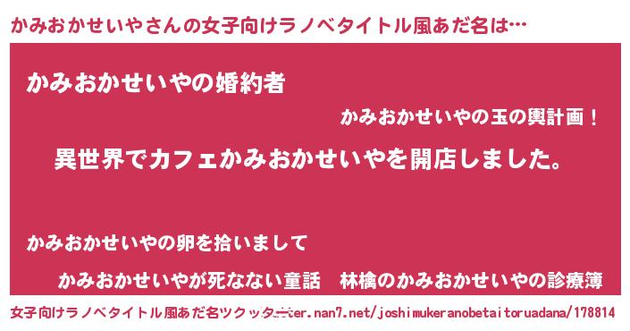 かみおかせいやさんの女子向けラノベタイトル風あだ名は… 『異世界でカフェかみおかせいやを開店しました。』『かみおかせいやの婚約者』『かみおかせいやが死なない童話 林檎のかみおかせいやの診療簿』 ツクッター #女子向けラノベタイトル風あだ名ツクッター http://tkutter.nan7.net/joshimukeranobetaitoruadana/178814/