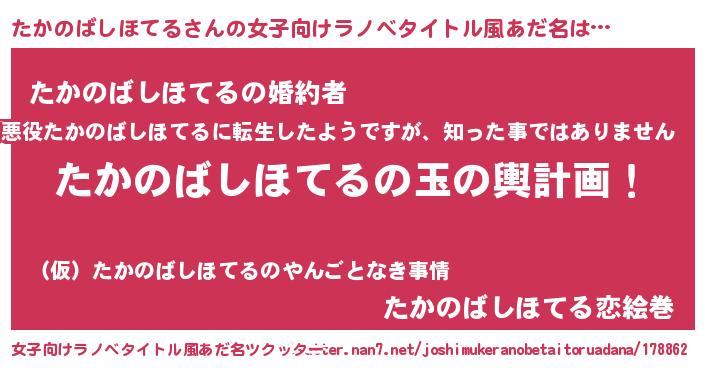 | 男性向けラノベタイトル風あだ名 | 『たかのばしほてる~年齢イコール彼女いない歴の魔法使い~』 |
