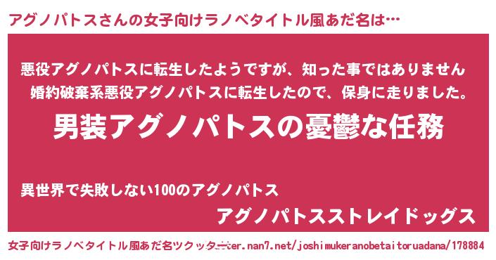 | 男性向けラノベタイトル風あだ名 | 『うちのアグノパトスが世界を掌握している!』 |
