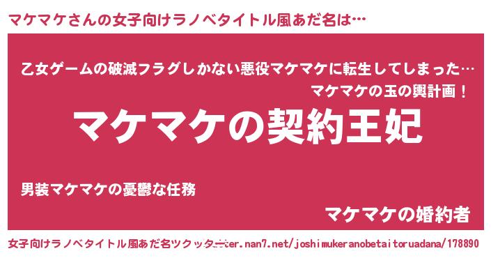 | 男性向けラノベタイトル風あだ名 | 『誰もが恐れるあのマケマケが、ぼくの専属メイドになるようです。』 |