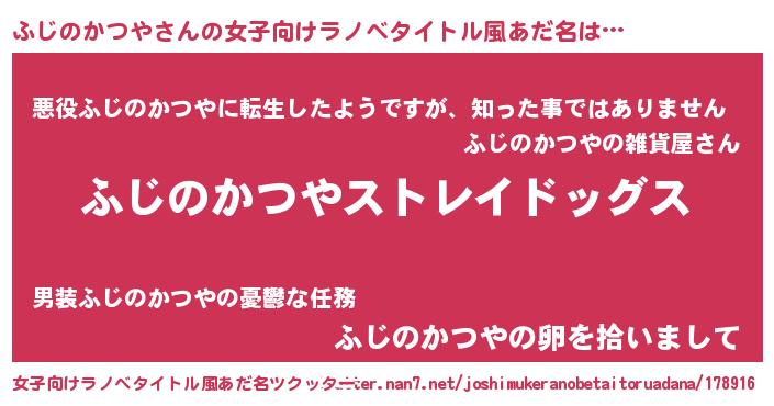 ふじのかつやさんの女子向けラノベタイトル風あだ名は… 『ふじのかつやストレイドッグス』『悪役ふじのかつやに転生したようですが、知った事ではありません』『ふじのかつやの卵を拾いまして』 ツクッター #女子向けラノベタイトル風あだ名ツクッター http://tkutter.nan7.net/joshimukeranobetaitoruadana/178916/