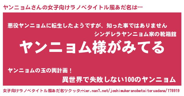 | 男性向けラノベタイトル風あだ名 | 『ヤンニョムの嫁は女の子じゃないと思った?』 |