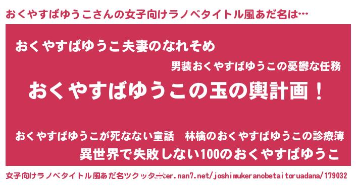 | 男性向けラノベタイトル風あだ名 | 『おくやすばゆうこ~年齢イコール彼女いない歴の魔法使い~』 |