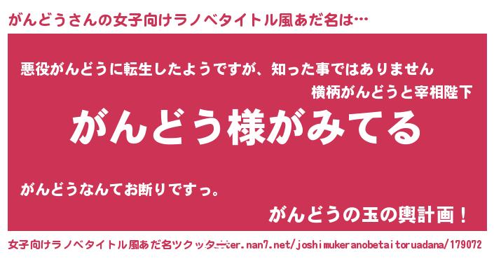 | 男性向けラノベタイトル風あだ名 | 『がんどうの嫁は女の子じゃないと思った?』 |