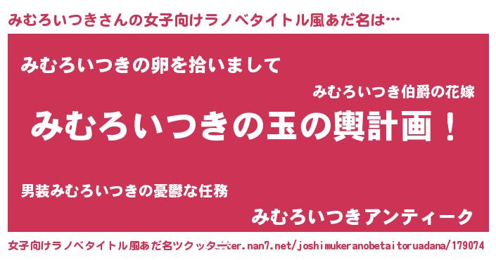 | 男性向けラノベタイトル風あだ名 | 『みむろいつき~年齢イコール彼女いない歴の魔法使い~』 |