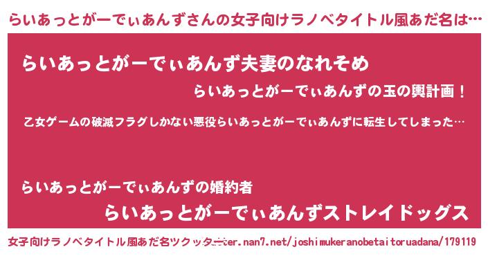 | 男性向けラノベタイトル風あだ名 | 『この素晴らしい世界にらいあっとがーでぃあんずを!』 |