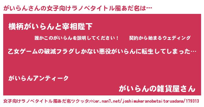 | 男性向けラノベタイトル風あだ名 | 『この素晴らしい世界にがいらんを!』 |