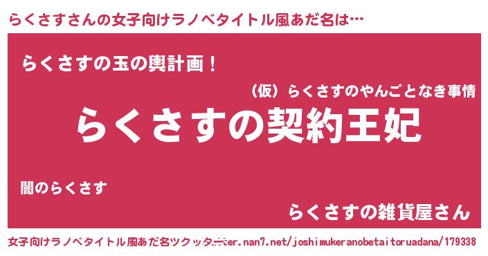 | 男性向けラノベタイトル風あだ名 | 『誰もが恐れるあのらくさすが、ぼくの専属メイドになるようです。』 |