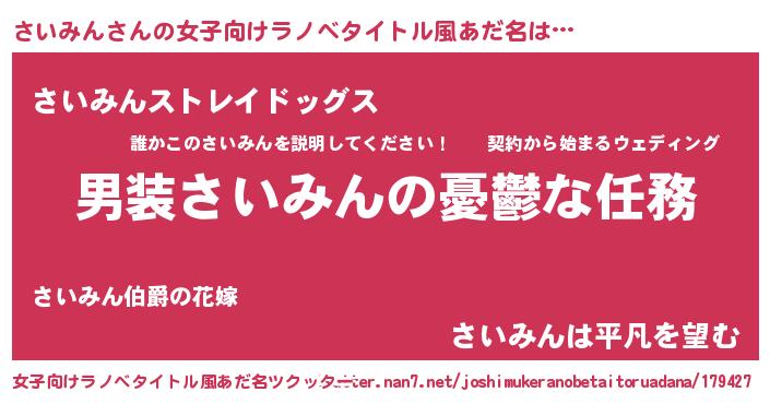 | 男性向けラノベタイトル風あだ名 | 『うちのさいみんが世界を掌握している!』 |