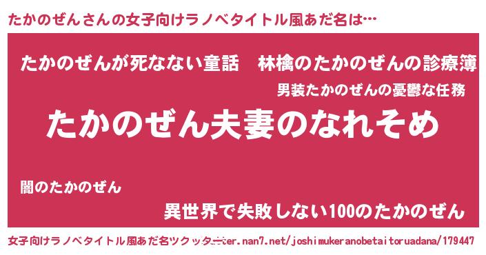| 男性向けラノベタイトル風あだ名 | 『おまえをオタクにしてやるから、俺をたかのぜんにしてくれ! 』 |