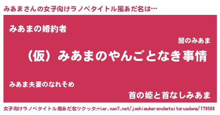 | 男性向けラノベタイトル風あだ名 | 『みあまの憂鬱』『はたらくみあまさま!』 |
