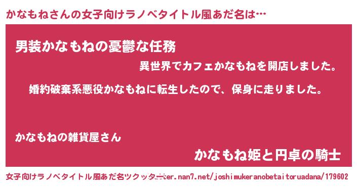| 男性向けラノベタイトル風あだ名 | 『カナモネスレイヤー』 |