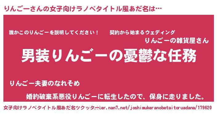 りんごーさんの女子向けラノベタイトル風あだ名は… 『男装りんごーの憂鬱な任務』『誰かこのりんごーを説明してください! ~契約から始まるウェディング~』『婚約破棄系悪役りんごーに転生したので、保身に走りました。』 ツクッター #女子向けラノベタイトル風あだ名ツクッター http://tkutter.nan7.net/joshimukeranobetaitoruadana/179620/