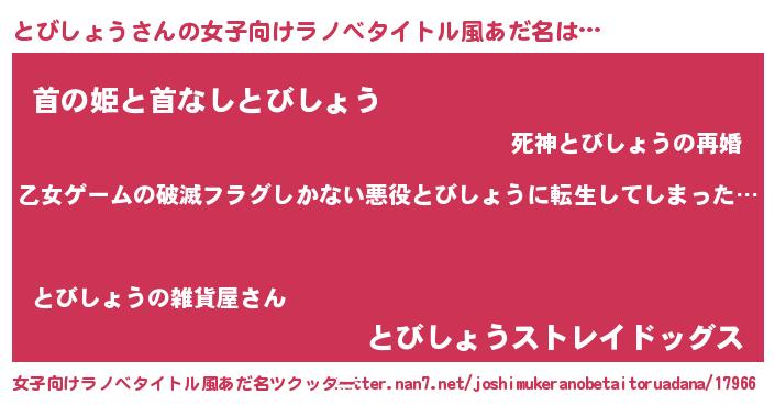 | 男性向けラノベタイトル風あだ名 | 『この素晴らしい世界にとびしょうを!』 |
