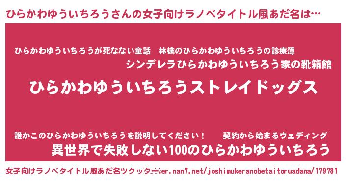 | 男性向けラノベタイトル風あだ名 | 『Re:ひらかわゆういちろうから始める異世界生活』 |