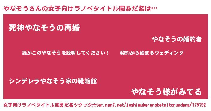 | 男性向けラノベタイトル風あだ名 | 『ヤナソウアートオンライン』 |