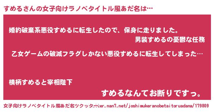 | 男性向けラノベタイトル風あだ名 | 『魔弾の王とすめる』『スメルスレイヤー』 |