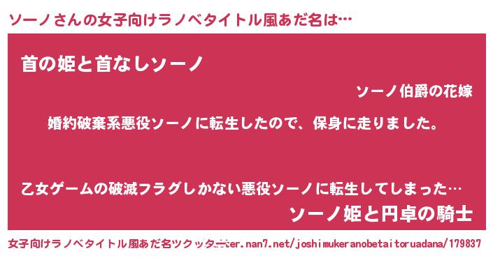 | 男性向けラノベタイトル風あだ名 | 『転生したらソーノだった件』 |