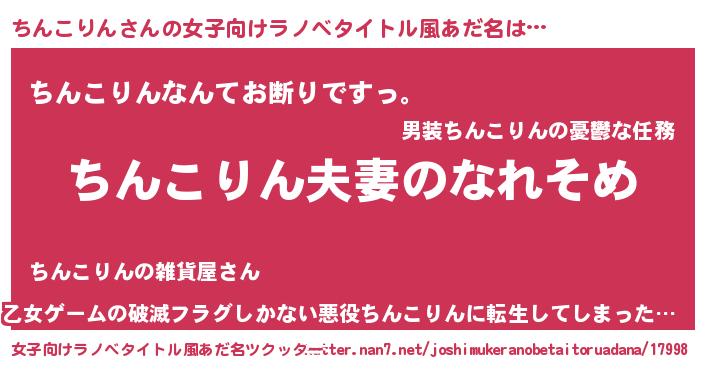 | 男性向けラノベタイトル風あだ名 | 『おまえをオタクにしてやるから、俺をちんこりんにしてくれ! 』 |