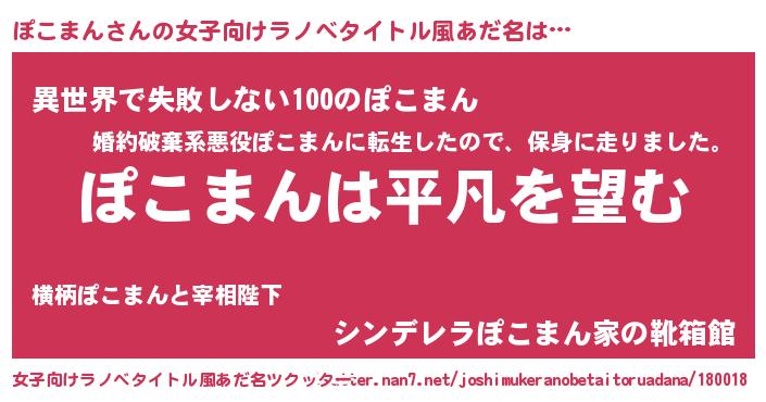 | 男性向けラノベタイトル風あだ名 | 『ダンジョンにぽこまんを求めるのは間違っているだろうか』 |