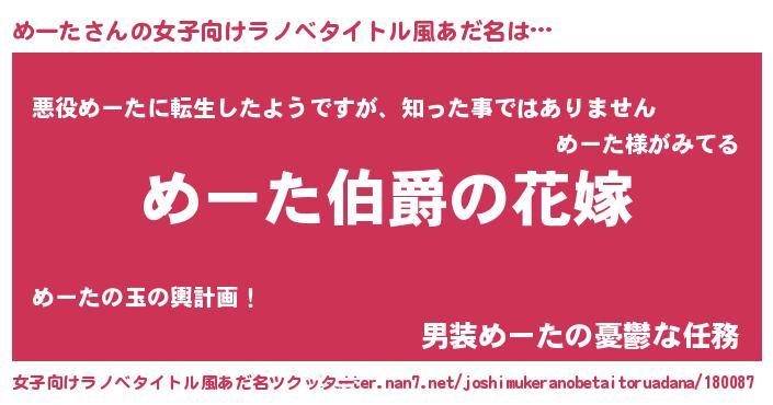 | 男性向けラノベタイトル風あだ名 | 『うちの娘の為ならば、俺はもしかしたらめーたも倒せるかもしれない。』 |