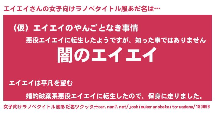 | 男性向けラノベタイトル風あだ名 | 『Re:エイエイから始める異世界生活』 |