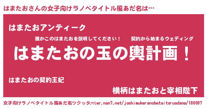 | 男性向けラノベタイトル風あだ名 | 『転生したらはまたおだった件』 |