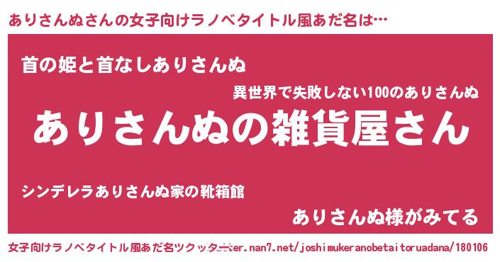 | 男性向けラノベタイトル風あだ名 | 『やはりありさんぬの青春ラブコメはまちがっている 』 |