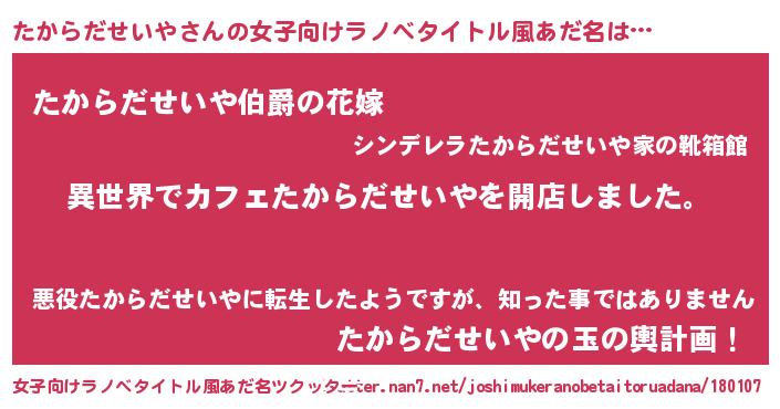 | 男性向けラノベタイトル風あだ名 | 『誰もが恐れるあのたからだせいやが、ぼくの専属メイドになるようです。』 |