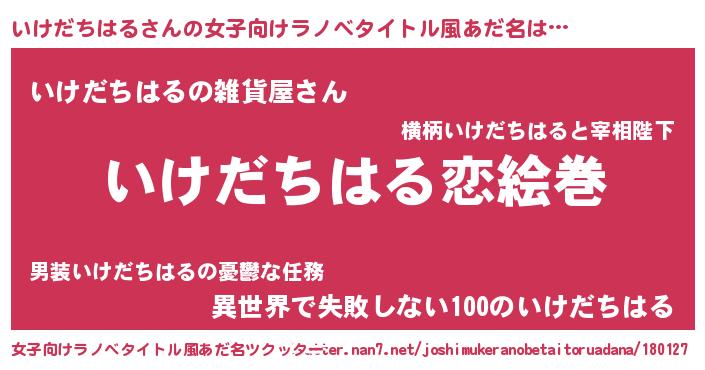 | 男性向けラノベタイトル風あだ名 | 『おまえをオタクにしてやるから、俺をいけだちはるにしてくれ! 』 |