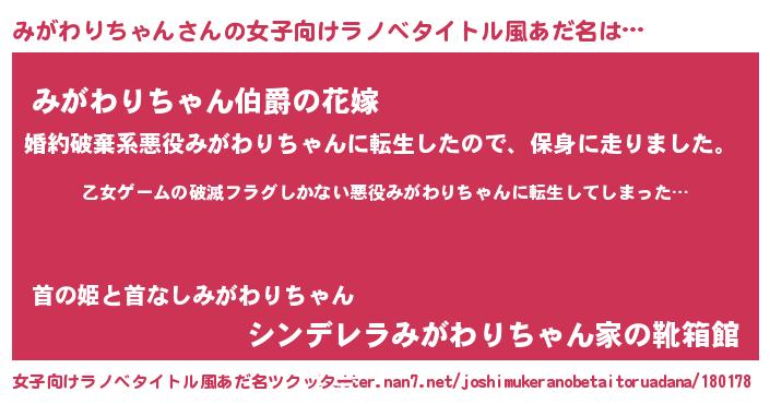 | 男性向けラノベタイトル風あだ名 | 『この素晴らしい世界にみがわりちゃんを!』 |