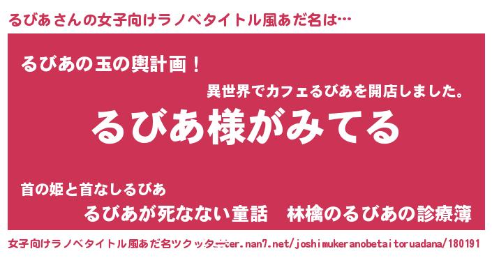 | 男性向けラノベタイトル風あだ名 | 『るびあの嫁は女の子じゃないと思った?』 |