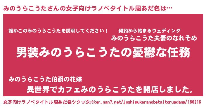 | 男性向けラノベタイトル風あだ名 | 『うちのみのうらこうたが世界を掌握している!』 |