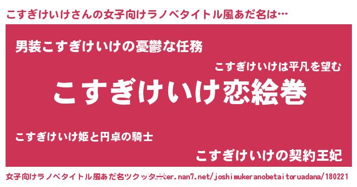 | 男性向けラノベタイトル風あだ名 | 『ノーゲーム・ノーコスギケイケ』 |