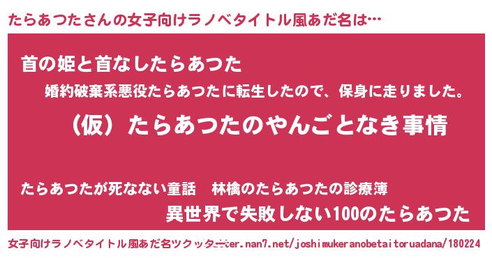 | 胡散臭い通販商品みたいなあだ名 | 『必ず成功するブレスレット…その名も「たらあつた」』 |