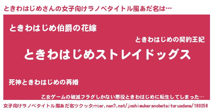 | 男性向けラノベタイトル風あだ名 | 『Re:ときわはじめから始める異世界生活』 |