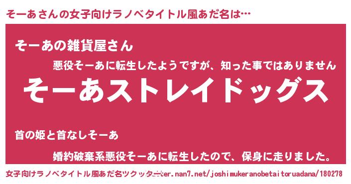 | 男性向けラノベタイトル風あだ名 | 『Re:そーあから始める異世界生活』 |
