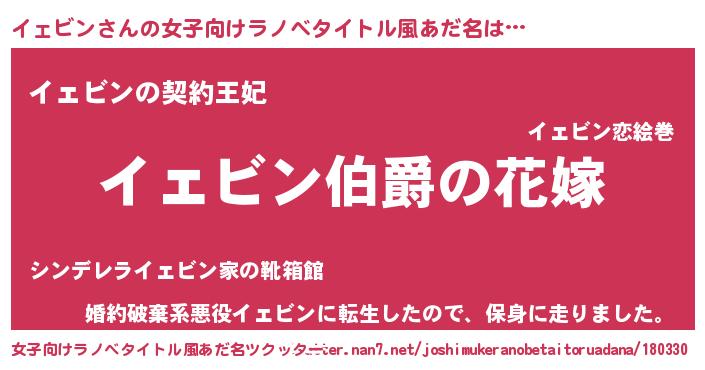 | 男性向けラノベタイトル風あだ名 | 『うちの娘の為ならば、俺はもしかしたらイェビンも倒せるかもしれない。』 |