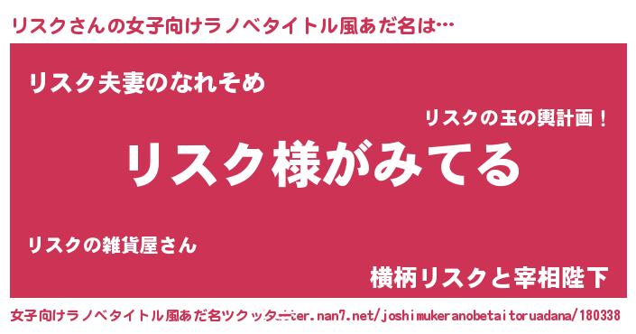 リスクさんの女子向けラノベタイトル風あだ名は… 『リスク様がみてる』『リスク夫妻のなれそめ』『横柄リスクと宰相陛下』 ツクッター #女子向けラノベタイトル風あだ名ツクッター http://tkutter.nan7.net/joshimukeranobetaitoruadana/180338/