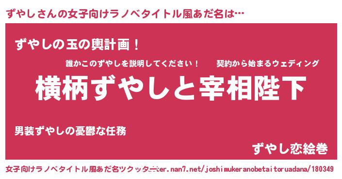 | 男性向けラノベタイトル風あだ名 | 『ずやしに滅ぼされるだけの簡単なお仕事です』 |