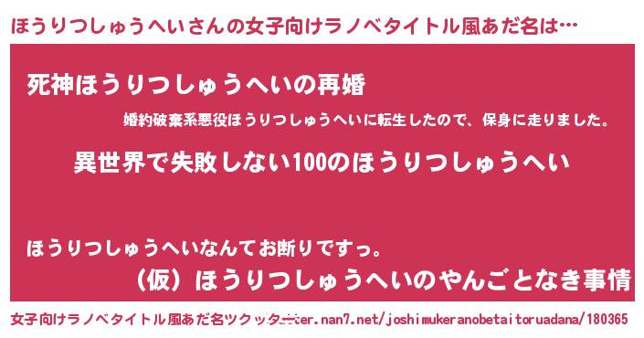 | 胡散臭い通販商品みたいなあだ名 | 『絶対に幸福をもたらす水素水…その名も「ほうりつしゅうへい」』 |