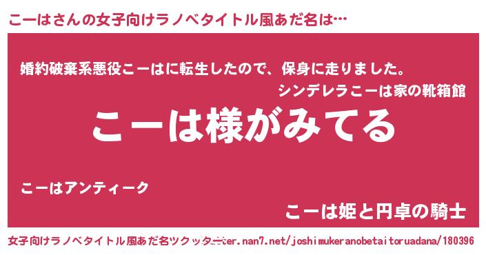 | 男性向けラノベタイトル風あだ名 | 『こーはの嫁は女の子じゃないと思った?』 |