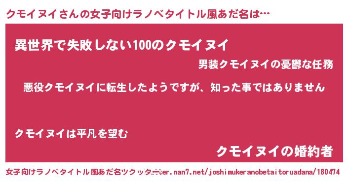 | 意味不明あだ名 | 『住所不定無職クモイヌイ(91歳)』 |