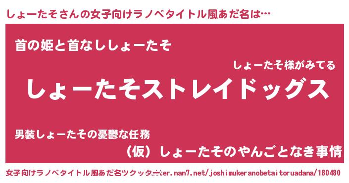 | 男性向けラノベタイトル風あだ名 | 『Re:しょーたそから始める異世界生活』 |