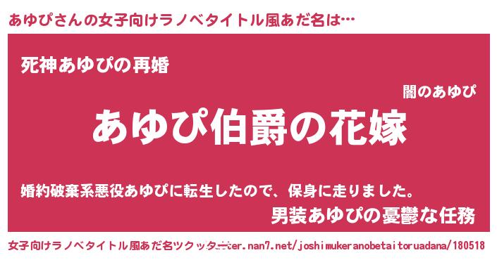 | 男性向けラノベタイトル風あだ名 | 『やはりあゆぴの青春ラブコメはまちがっている 』 |